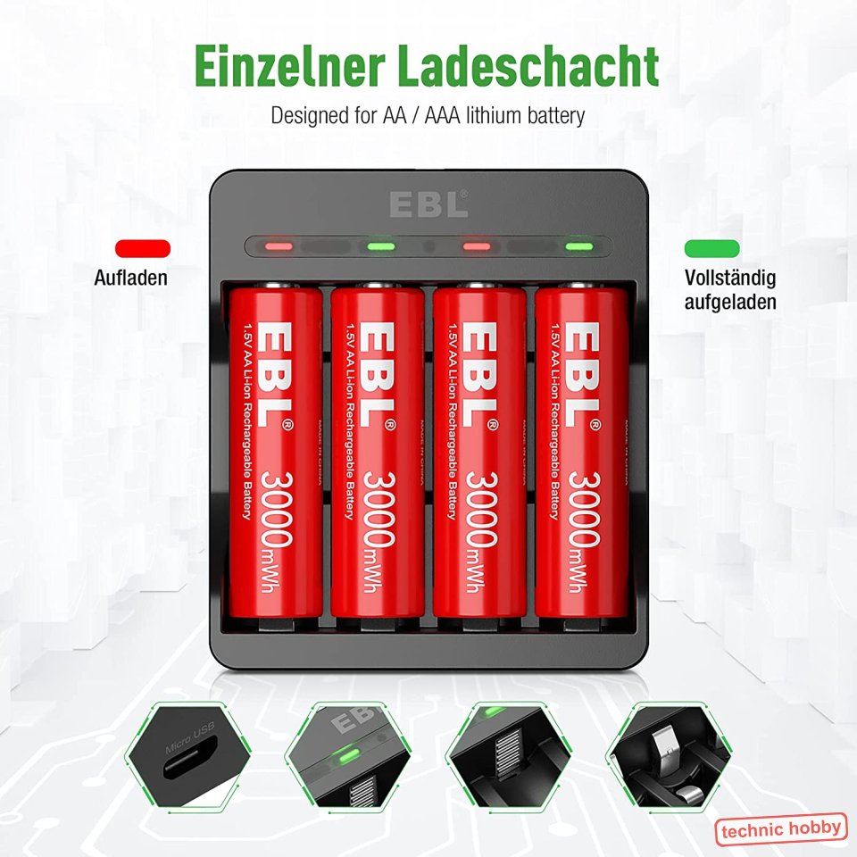 - 1 x Intelligentes Ladegerät speziell für diese AA Li-Ionen Zellen