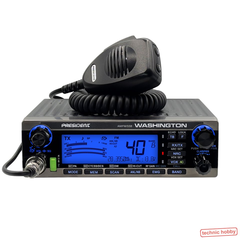 Beim President Washington Amateurfunkgerät mit AM/FM/SSB muss man auf keine Funktionen mehr verzichten. Der Frequenzbereich deckt das komplette 10m- und 12m-Band ab, die Leistung ist bei AM/FM bis 50 Watt und bei SSB bis ca. 70-80 Watt PEP stufenlos regelbar.