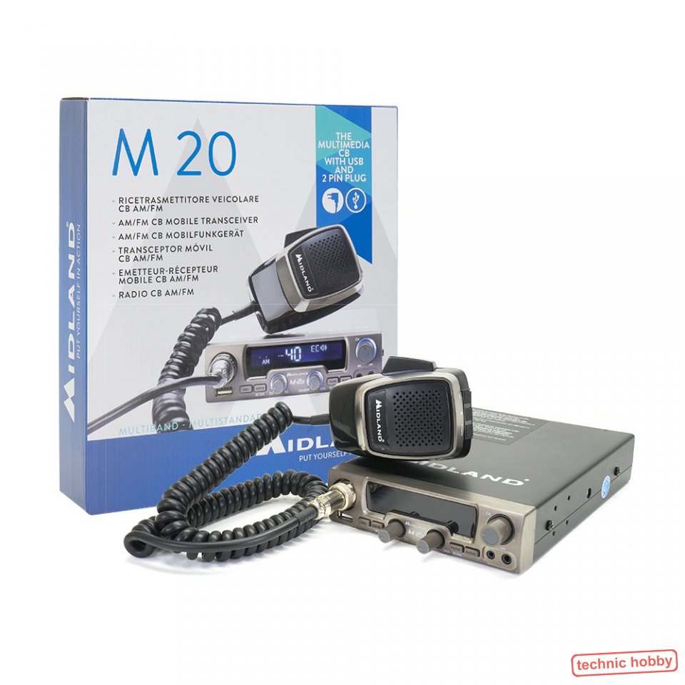 Das Midland M-20 CB-Funkgerät kommt als zweites Modell der neuen Midland M-Serie im frischen High-Tech-Design in kompakter Form daher und bietet als Novum eine Doppelbuchse für den Multimedia-Einsatz im Fahrzeug.