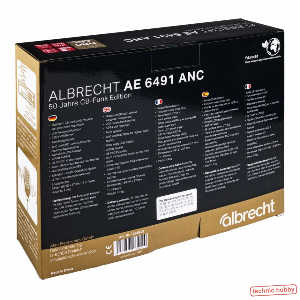 CB Funk für DIN Schacht mit 12/24 Volt und Frontlautsprecher. Das Multinorm CB-Funkgerät mit modernster Technik und sehr einfacher Bedienung, Dank einfachster und übersichtlicher Bedienung zugeschnitten für den Einsatz in LKW und Fahrzeugen, aber auch Stationär ideal. Für die neueste Version der AE 6491 hat Albrecht eine weitere technische Innovation entwickelt und ANC zu NRC in das CB-Funkgerät hinzu integriert: Damit sind ANC und NRC Geräuschfilter nun Standard. Der NRC filtert Rauschen und andere Störgeräusche aus eingehenden Funksprüchen heraus. Der ANC reduziert Störgeräusche, die beim Senden vom Mikrofon mit aufgenommen werden. Somit werden z.B. Wind- und Motorgeräusche in Ihren Funksprüchen verringert. Beide Geräuschfilter in Kombination bringen eine nie dagewesene Audio-Qualität im CB-Funkbereich! Die Sprachverständlichkeit ist wesentlich bei Empfang & Senden verbessert. Das Multinorm CB-Funkgerät Albrecht AE 6491 NRC zeichnet sich durch einen sehr einfachen Einbau aus und darf europaweit verwendet werden Als Option kann man auch das Albrecht VOX Mikrofon zum AE 6491 ANC kombinieren. VOX Mikrofon hat einen Schalter für ANC On/Off. Multinorm, in ganz Europa zugelassen! |