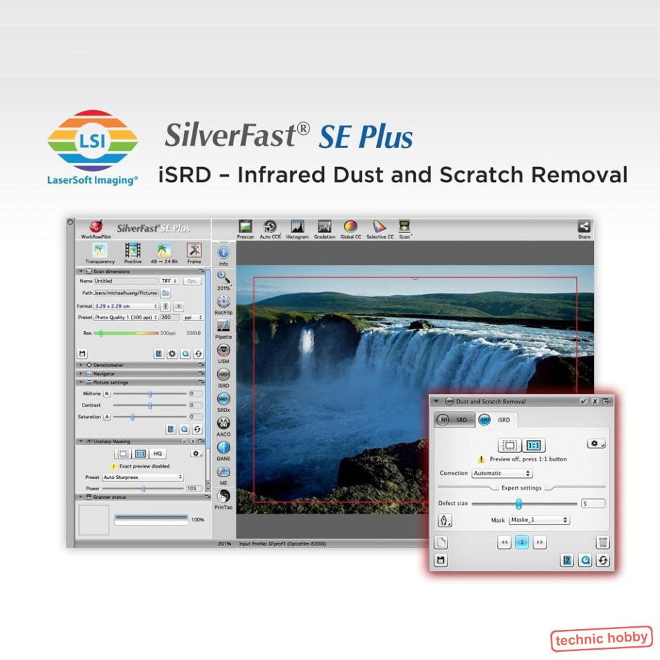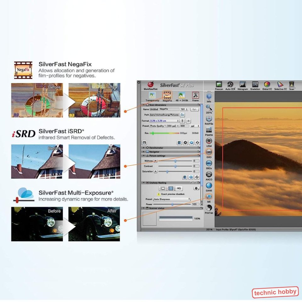 oder auch Mehrfach-Belichtung, bietet ein Verfahren zur Erhöhung des Dynamikumfanges und spielt eine entscheidende Rolle für hohe Qualität. SilverFast iSRD® nutzt den im Gerät integrierten Infrarotkanal zur Entfernung von Staub und Kratzern auf der Vorlagenoberfläche und die SilverFast SCC® Funktion ermöglicht Selektive Farbkorrektur für einfache Farbanpassungen.