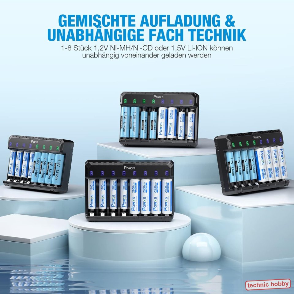 ???? [Basis-Ladegerät für mehr Kompatibilität] - POWXS AA AAA Akku ladegerät hat 8 Ladeschächte und kann gleichzeitig AA AAA Akkus laden. Es unterstützt das Laden von 1,5 V Lithium-ion und 1,2 V NIMH/NICD qualifizierten Batterien.