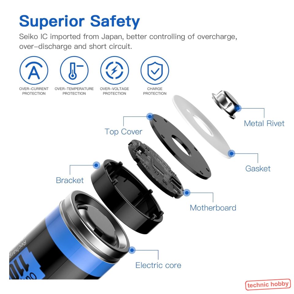 Vorteil dieser neuen Akkutechnik ist der spezielle Aufbau der Zellen mit eingebautem Regler. Konstante Spannung von 1,5 Volt bis zum Schluß. Schutzschaltung gegen tiefentladen, Überspannung usw ist eingebaut in jeder Zelle.