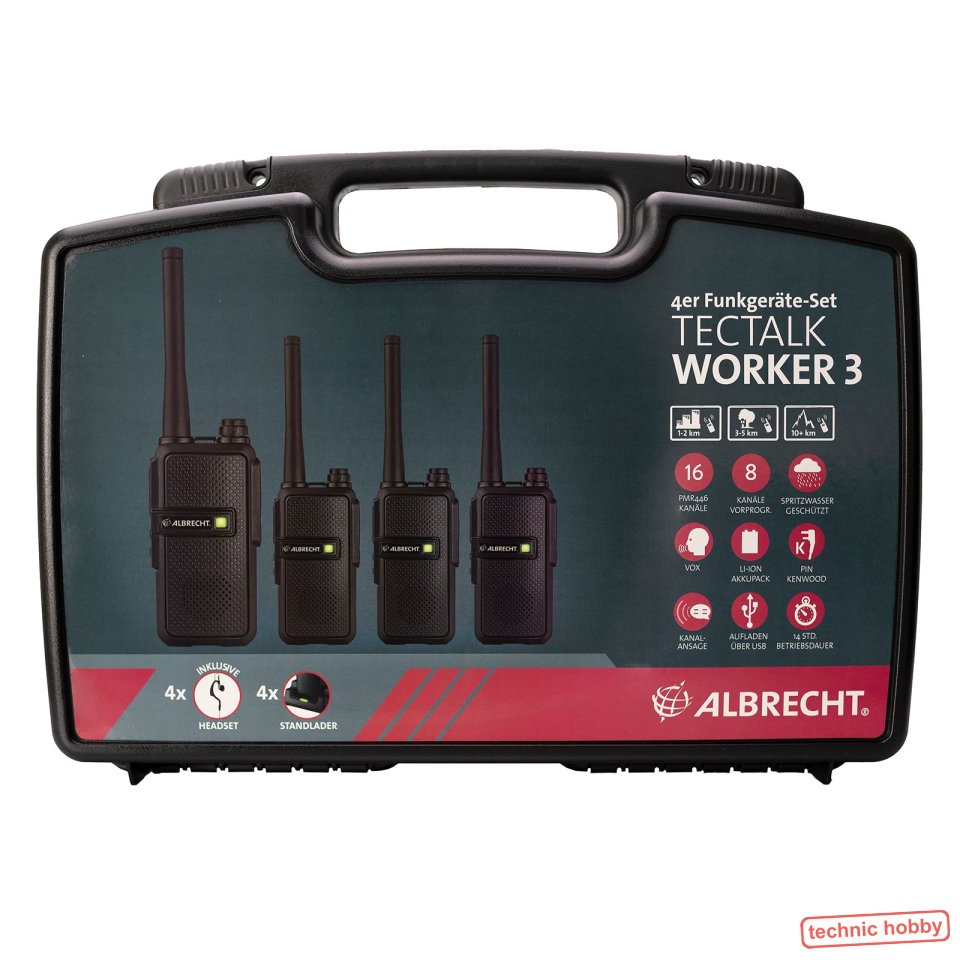 Ein Koffer und alles drin für den Kontakt zum Kollegen auf der Baustelle: Funkgeräte, Mikrofon, Akkus, Ladegeräte, Aufladen und los geht ́s! Tectalk Worker 2 - Das Sprechfunkgerät für Handwerker überzeugt insbesondere den professionellen Anwender durch das äußerst stabile Gehäuse und die diversen Funktionen. Das regenwassergeschützte Gehäuse ist optimal für den Einsatz im Freien geeignet. 16 PMR446 Kanäle (8 mit CTCSS vorprogrammiert) · Stabiles und robustes Gehäuse, regenwassergeschützt · Senden wahlweise mit Sendetaste oder Freisprechen (VOX) · Scanfunktion · Kräftige Wiedergabe und gute Modulation - auch mit dem Lautsprechermikrofon · Energiesparmodus · Betriebsdauer ca. 14 Std. · wechselbarer Akku · diverse Funktionen per optionaler Software programmierbar · Aufladen über Micro-USB Buchse oder Standlader · Kenwood Headsetbuchse · Akkuanzeige |