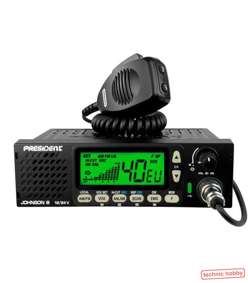President Johnson III ist ein Multikanalnorm CB-Mobilfunkgerät, welches u.a. mit dem Modell Stabo XM5003 vergleichbar ist. Es ist besonders geeignet für den Einbau in Fahrzeugen, wie PKW, LKW, Caravan, etc.