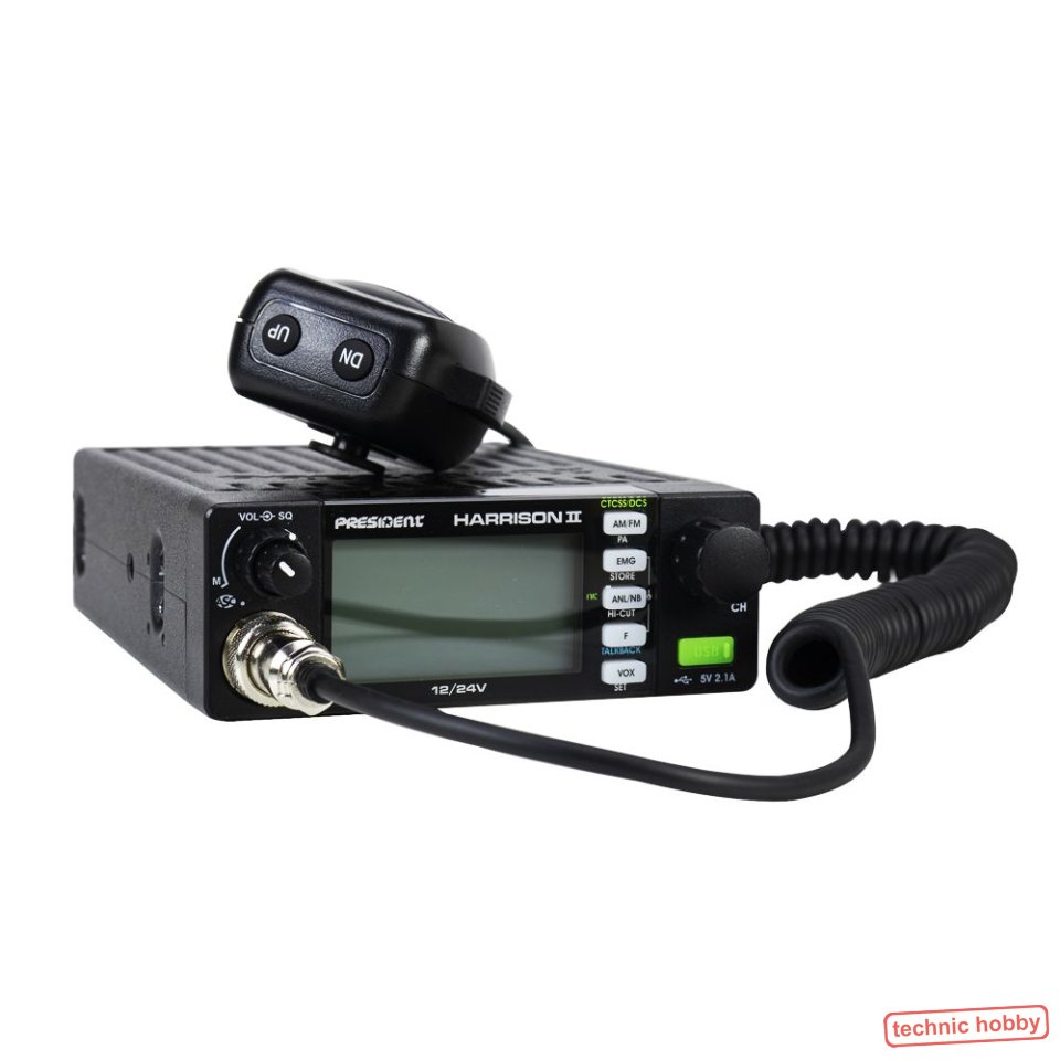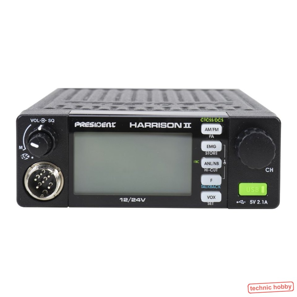 Die President Harrison ist ein CB-Funkgerät mit umschaltbaren Kanalnormen, 12 Volt oder 24 Volt DC Stromversorgung. Damit eignet es sich besonders für die Verwendung in Fahrzeugen, wobei es unabhängig entweder mit 12 Volt 8z.B. PKW) oder 24 Volt (z.B. LKW) mit Spannung versorgt werden kann. Die Erkennung erfolgt automatisch.