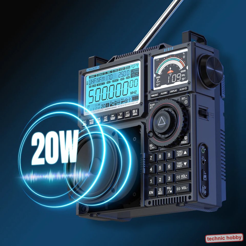Multiband-Welt-Empfänger FM, AM, SW, CB, VHF, UHF, WX, AIR mit SSB. Maßgeschneidert für den weltweiten Einsatz, mit hervorragendem Sound. Die Evolution des RF75A und RF760 in der nächsten Stufe. Mittels der Präzisionsabstimmung erfolgt die Frequenzwahl mit zwei Knöpfen mit sattem Klicken oder man verwendet die Schnellabstimmungstasten. Der RF919 speichern bis zu 1600 Kanäle. Dual-Display, der 3,54-Zoll-Hauptbildschirm liefert wichtige Empfangsdetails, ergänzt durch einen sekundären Bildschirm für Signalstärke und Uhrzeit. Mittels der Remote-App-Steuerung kann der RF919 Weltempfänger mühelos bedient werden. Einhändige Bedienung trifft auf leistungsstarke Wireless-Funktionalität für eine nahtlose Steuerung über ein Smartphone. Der RF919 verfügt über einen starken 5000 mAh Akku, Bluetooth-Konnektivität, Micro-SD-Unterstützung und ein leistungsstarkes 20-W-Lautsprechersystem für ein überragendes Audioerlebnis. USB-C Ladebuchse und zur Verbindung mit PC / Notebook als Lautsprecher usw. Hervorragende Antennenkonnektivität durch drei externen Antennenoptionen für unübertroffene Klarheit auf allen Bändern. Optimaler Empfang unabhängig von Ihrem Standort ist damit garantiert. |