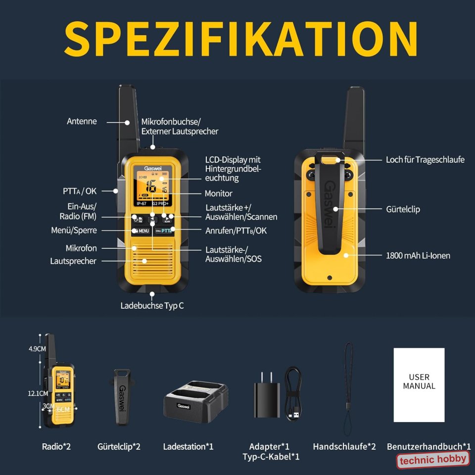 Mit dem 1800mAh Akku bietet es eine hohe Betriebsdauer von ca. 20 Stunden. Es ist nach IP67 Standard zertifiziert, sodass es auch bei Wind und Wetter verwendet werden kann. VOX-Freisprechfunktion. CTCSS/DCIM Töne.