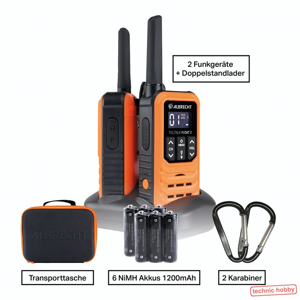 Das wassergeschützte, staubdichte und schwimmfähige (IP67) mit Blinklicht bei Kontakt mit Wasser! Maximal bis zu 10km Reichweite bei freiem Gelände, Das PMR Sprechfunkgerät TecTalk Float 2 ist die ideale Lösung für den Professionellen- und Freizeitbereich. Ideal für Outdoor, Eventsveranstalter, Rafting, Canoning oder auf der Piste. Inklusive MiMh Akkus und 2 fach Standlader, Gürtelclip, Karabiner, Koffer |