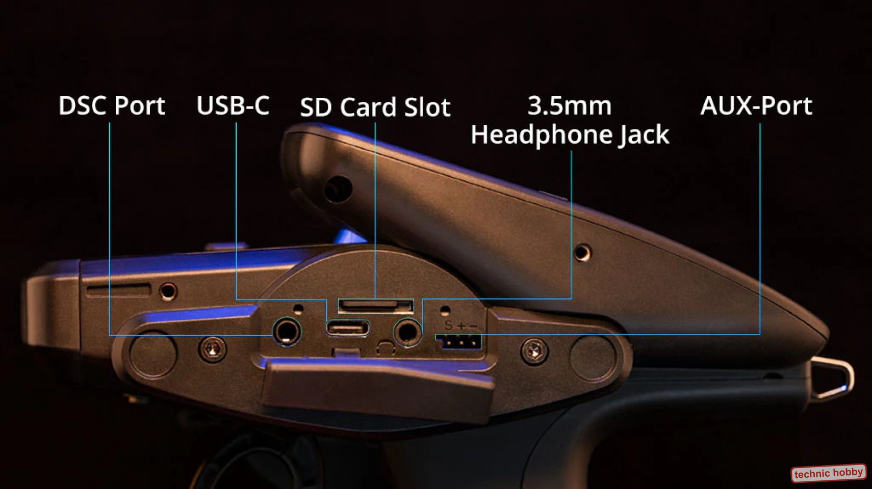 Der Sender hat fünf programmierbare Trimmungen, zwei Proportionsräder und drei Schalter. Dem Funkgerät kann ein Erweiterungsmodul hinzugefügt werden, das entweder zwei zusätzliche Schalter oder einen Joystick enthält. Die Antenne des Funkgeräts kann um 90° gedreht werden, um die Polarisation der Antenne am RC-Modell anzupassen.