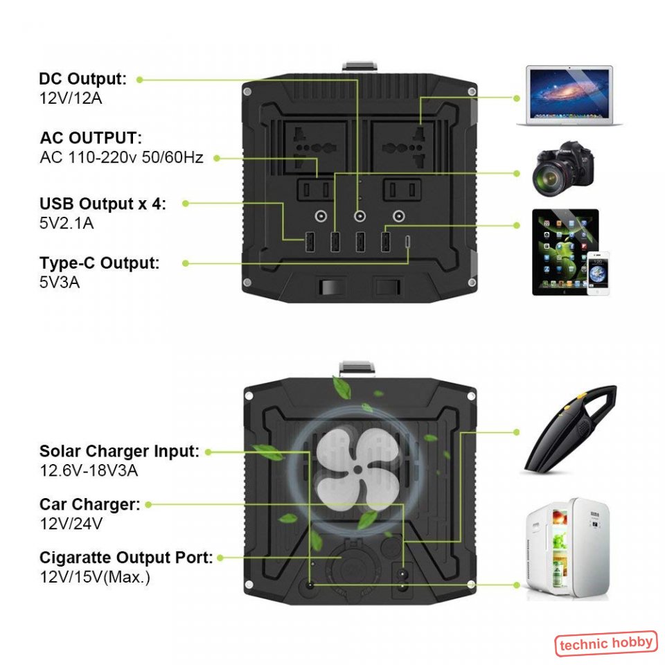 3-in-1-Aufladung: Netzunabhängige Stromversorgung für Camping- oder als Notversorgung, Leuchten, Telefon, Laptop, Fernseher und sogar Mini-Kühlschränke können so mit Energie versorgt werden.