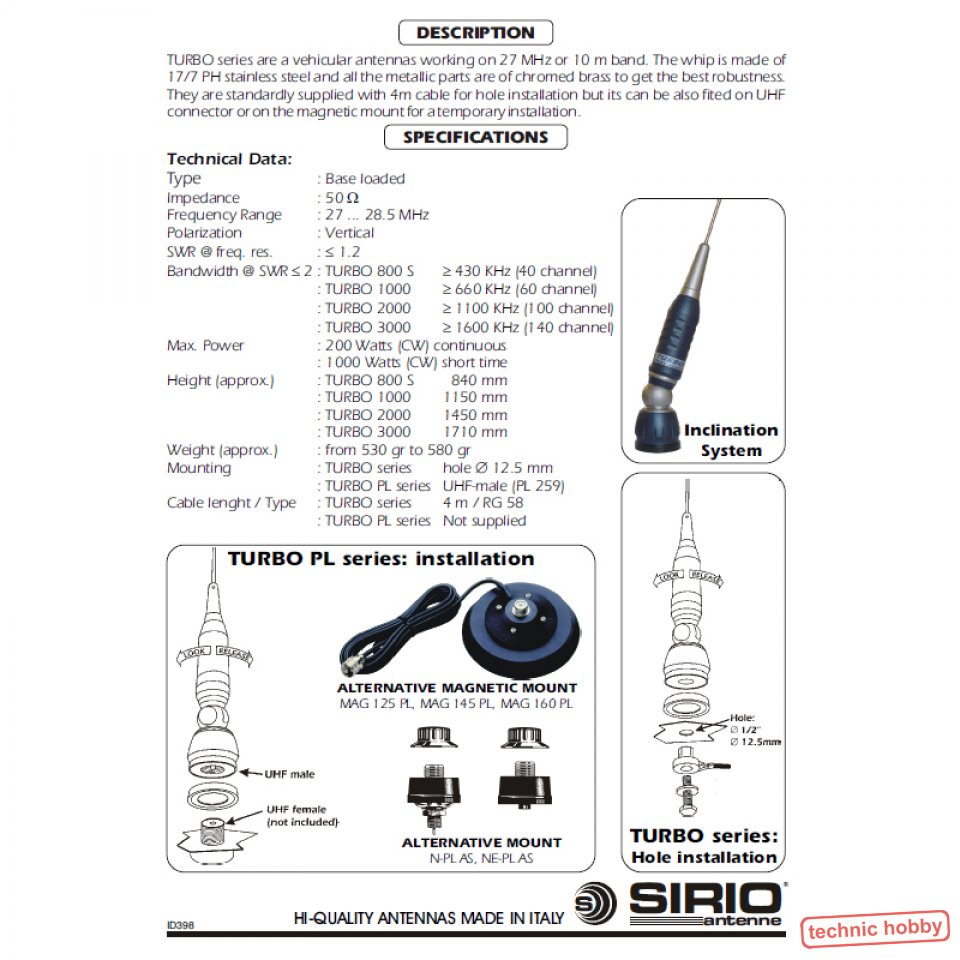 - Montage: 12,5 mm Bohrung (alternativ Magnetfuß mit PL259 Buchse)