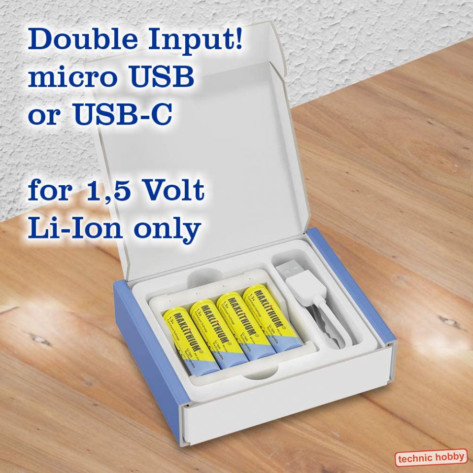 inkl. Li-Ionen Ladegerät, micro USB/USB-C