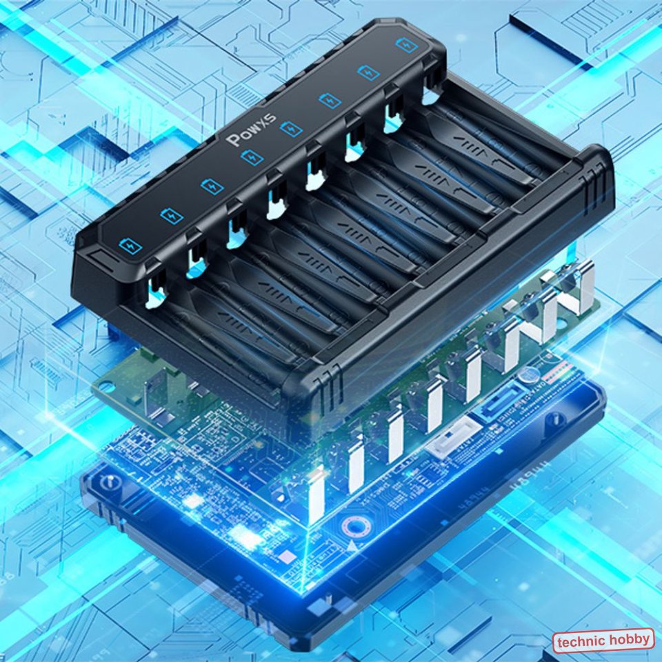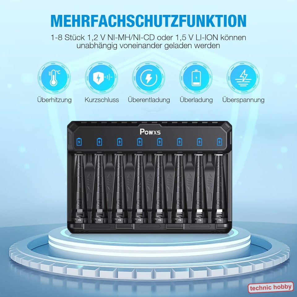 ???? [Basis-Ladegerät für mehr Kompatibilität] - POWXS AA AAA Akku ladegerät hat 8 Ladeschächte und kann gleichzeitig AA AAA Akkus laden. Es unterstützt das Laden von 1,5 V Lithium-ion und 1,2 V NIMH/NICD qualifizierten Batterien.