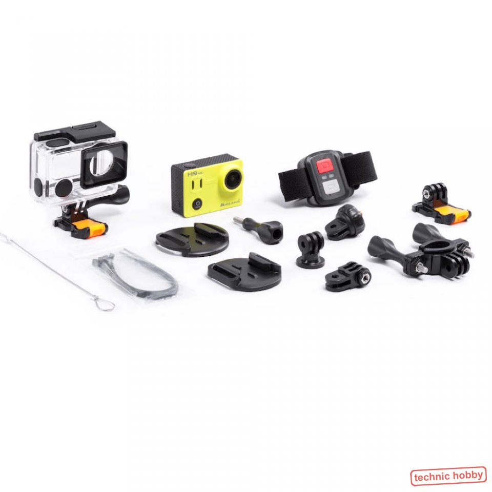 - H9 Action Kamera, Fernbedienung, wasserdichtes Gehäuse, 2 Helmhalterung, Lenkerhalterung, USB-Ladekabel, Akku 1050 mAh, Adapter für andere Modelle. Sicherungsband, Kabelbinder