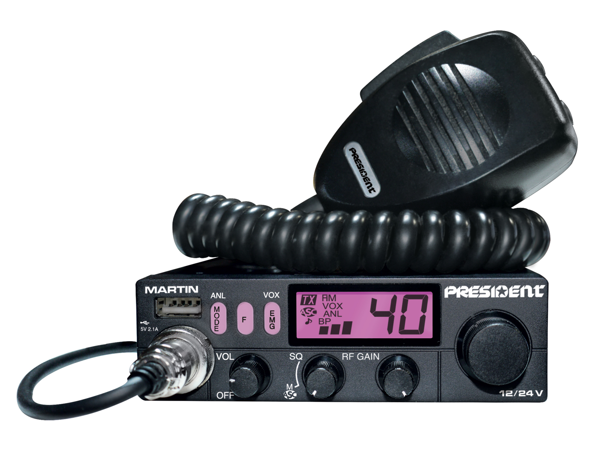 Die President MARTIN ASC ist ein CB-Funkgerät mit umschaltbaren Kanalnormen, Frontlautsprecher, sowie 12 Volt oder 24 Volt DC Stromversorgung. Damit eignet es sich besonders für die Verwendung in Fahrzeugen, wobei es unabhängig entweder mit 12 Volt 8z.B. PKW) oder 24 Volt (z.B. LKW) mit Spannung versorgt werden kann. Die Erkennung erfolgt automatisch.