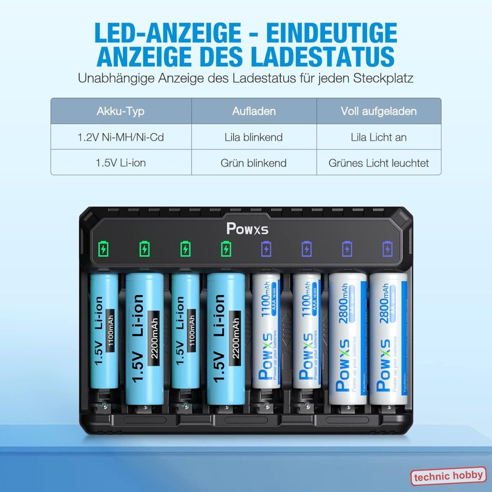 ???? [Basis-Ladegerät für mehr Kompatibilität] - POWXS AA AAA Akku ladegerät hat 8 Ladeschächte und kann gleichzeitig AA AAA Akkus laden. Es unterstützt das Laden von 1,5 V Lithium-ion und 1,2 V NIMH/NICD qualifizierten Batterien.