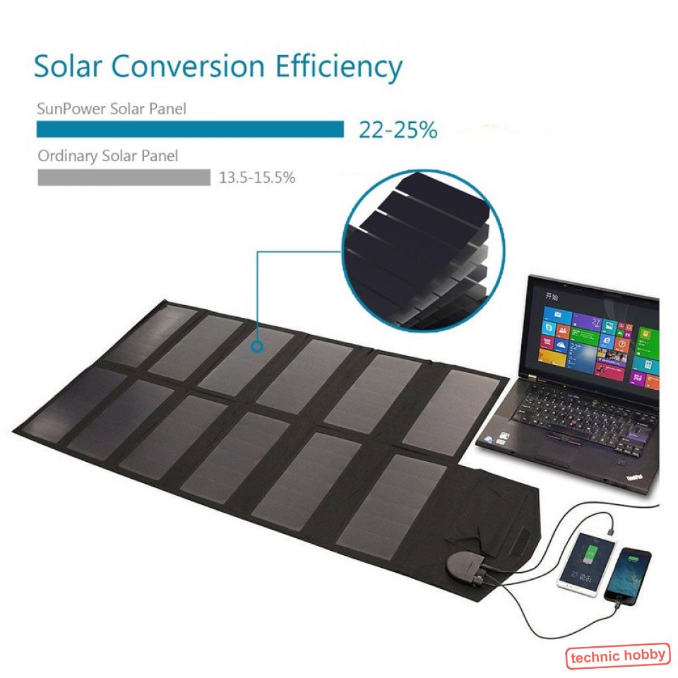 Faltbares Solarpanel mit hoher Effizienz. Sunpower Solarpanele haben eine Wirkungsgrad von 22% -25% und bietet damit ausreichende Solar Leistung um zwei Geräte z.B: Handy, Tablet usw. gleichzeitig aufzuladen.