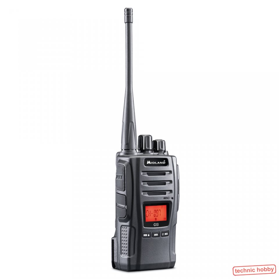 Das Midland G13 ist ein semi-professionelles PMR 446 Handfunkgerät. Mit seinem Aluminiumguss-Gehäuse ist es sehr kompakt und extrem robust. Es ist Gemäß IPX4 vor Staub und Wasser geschützt.