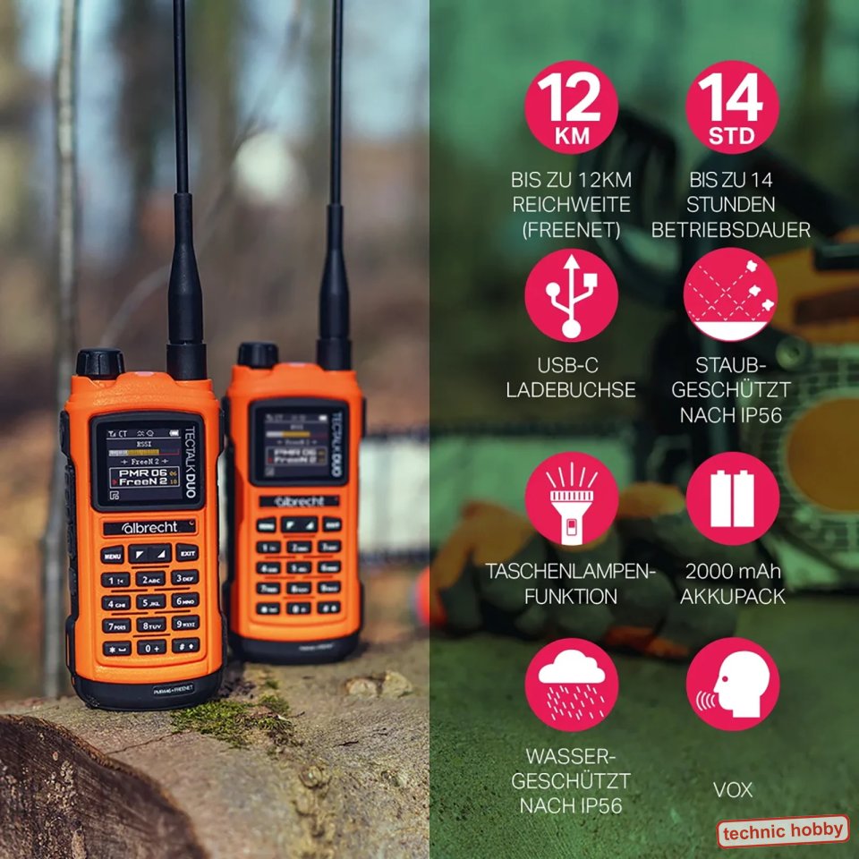 Das neue und leistungsstarke Albrecht Tectalk Duo glänzt mit zwei Frequenzbändern: klassische PMR446 Frequenzen und Freenet (1 Watt Sendeleistung) für eine höhere Reichweite. Die Nutzung ist anmelde- und gebührenfrei. Das Albrecht Tectalk Duo bietet professionellen Anwendern ein äußerst stabiles Gehäuse in Signalfarbe und sehr umfangreiche Funktionen. Das spritzwassergeschützte Gehäuse eignet sich optimal für den Einsatz im Freien.