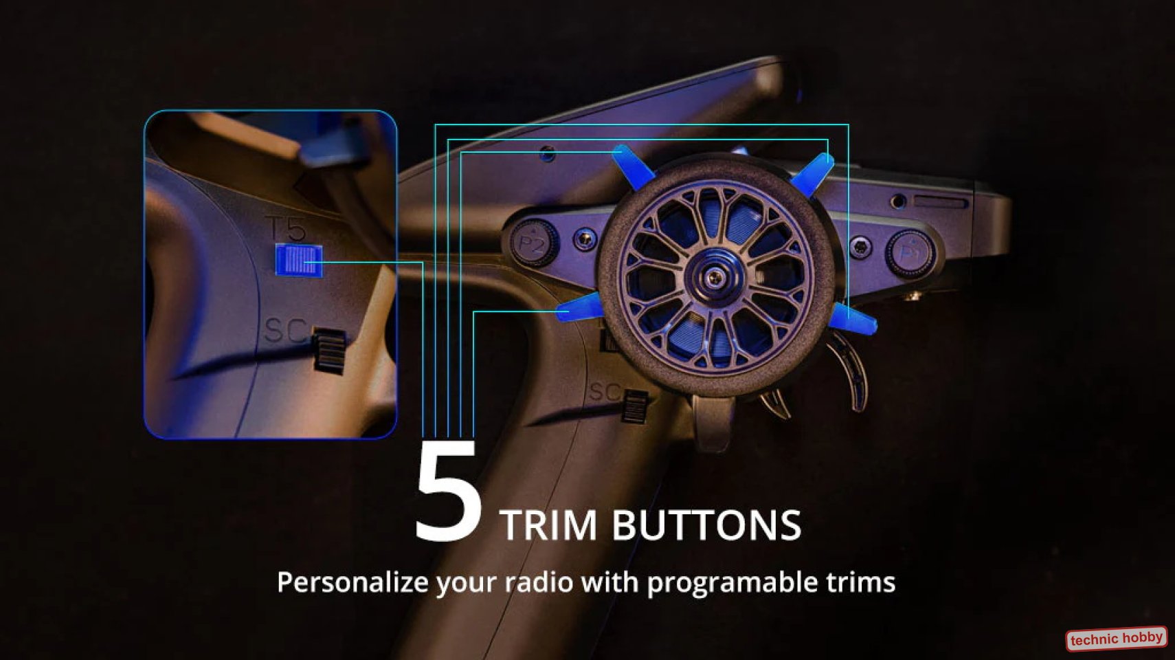 Der Sender hat fünf programmierbare Trimmungen, zwei Proportionsräder und drei Schalter. Dem Funkgerät kann ein Erweiterungsmodul hinzugefügt werden, das entweder zwei zusätzliche Schalter oder einen Joystick enthält. Die Antenne des Funkgeräts kann um 90° gedreht werden, um die Polarisation der Antenne am RC-Modell anzupassen.