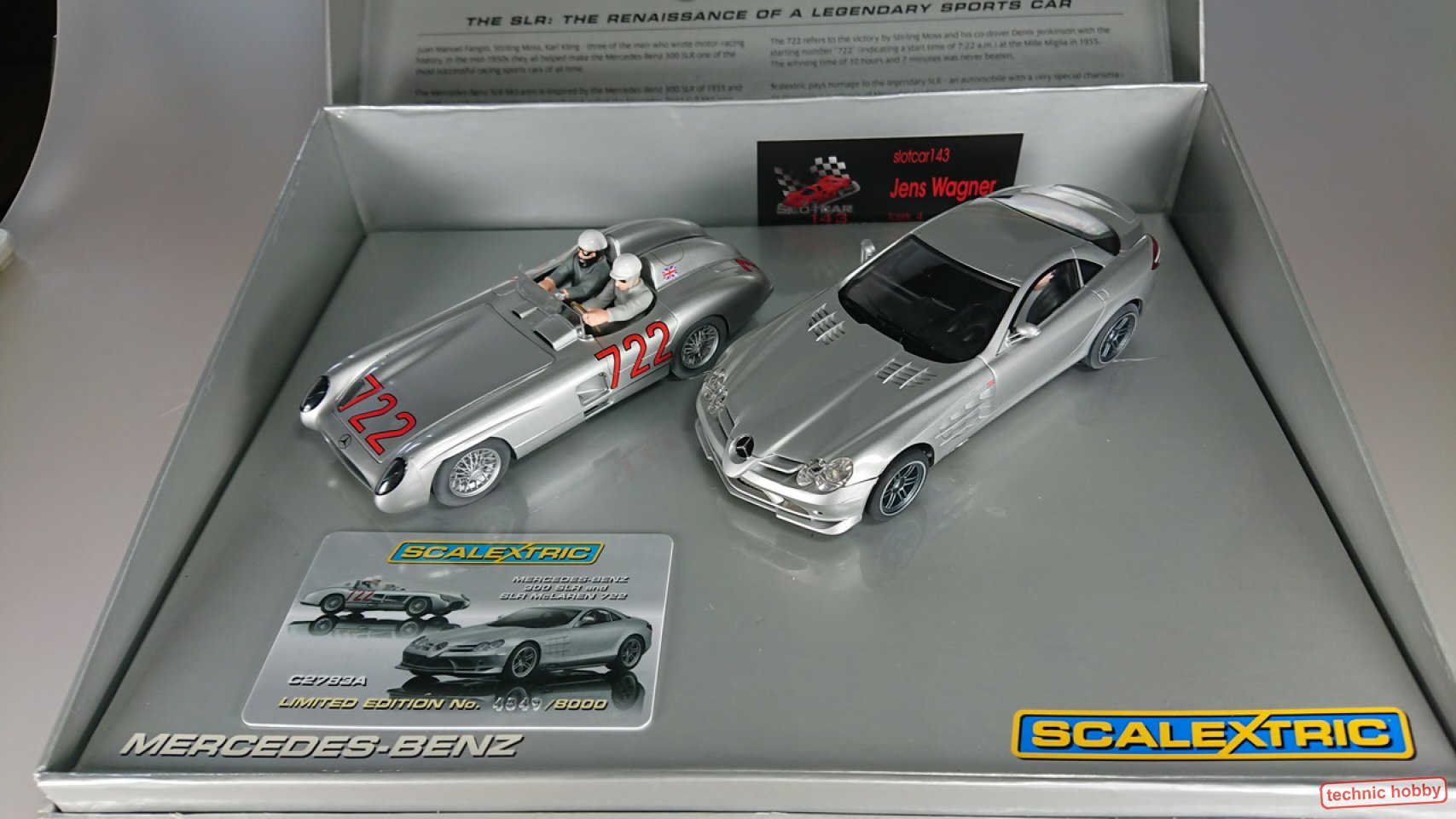 Zwei Legenden, der SLR von 1955 mit der Startnummer des Gewinners Juan Manuel Fangio und der moderne Nachfolger. Die liebevoll gestalteten Fahrzeuge entsprechen den 100% den Vorbildern. Beide Fahrzeuge können einfach und schnell für digitale Bahnen nachgerüstet werden. Zwei Scalextric Autos die keine Wünsche offen lassen in einer attraktiven Showbox. Inklusive Seriennummern Zertifikat (Card). Limitierte Auflage! - weltweit gibts es davon nur 8000 Stück Highlights